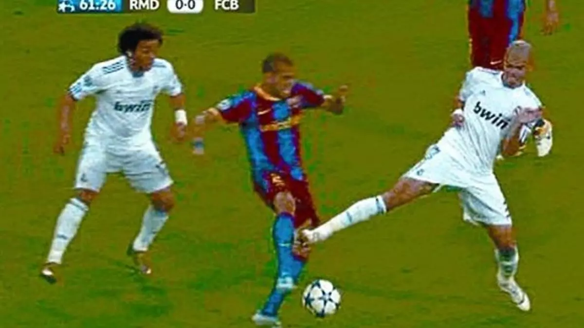 Demasiado preocupados por si, con un giro final karateca de talón, el coyote blanco conseguía enganchar o no el gemelo del correcaminos azulgrana, muchos no habían reparado en la explicación más sencilla: el brasileño vuela en el aire después de impactar al balón al mismo tiempo que Pepe llega en plancha. La virulencia con la que entra el luso es la que desplaza hacia atrás la pierna de Alves, que se coge el tobillo derecho dolorido y no el gemelo.