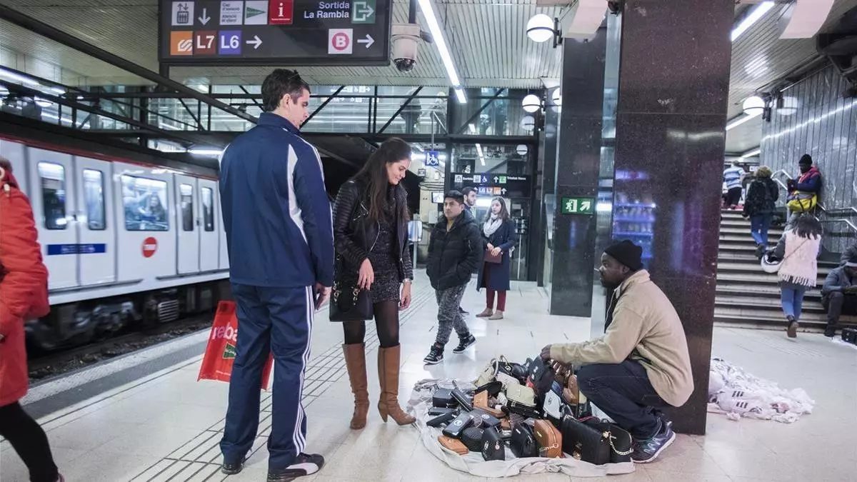 Llueve en el centro de Barcelona y el gentío se agolpa en el vestíbulo de la estación de Plaza de Catalunya, entre el trasiego de viajeros y quienes buscan resguardarse del chubasco. Entre estos últimos parece figurar una legión de vendedores del top manta, que han tendido sus escaparates de quita y pon alrededor de escaleras, torniquetes de acceso y paneles informativos. Pero acaba de llover y allí permanecen ellos, con sus muestrarios clandestinos, dejando claro que su presencia allí no es fugaz y que poco tiene que ver con las inclemencias meteorológicas, por más que lleven instalados de manera permanente desde finales del año pasado, con la llegada del frío. "Es una especie de refugio porque la policía les deja más tranquilos que en la superficie", asegura un camarero que trabaja en la zona.