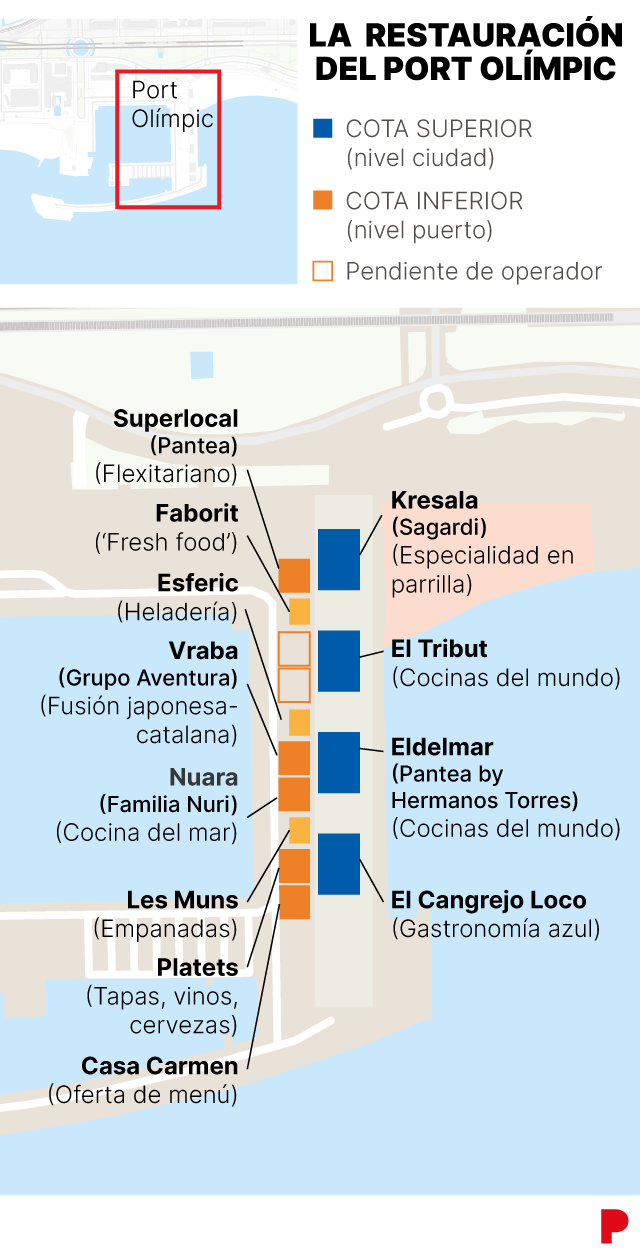 En la misma planta, abrirán en pocas semanas Platets (de tapas y vinos); Nuara, la nueva apuesta marinera de Família Nuri (que toma su nombre, en catalán, de hacer nudos marineros y de la pureza del producto, desnudo) y Vraba (fusión japo-catalana), mientras quedan vacantes los dos grandes locales por adjudicar. Fuentes de BSM, que estiman que todo el resto estará operativo hacia la primera quincena de octubre, señalan que los nuevos operadores que se hagan con dichos espacios libres podrán llevar a cabo las obras en invierno.