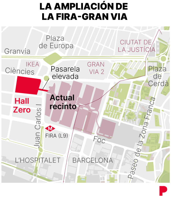 Una notoria pasarela roja de 2.200 metros conecta ya los ocho pabellones de la Fira de Barcelona en la Gran Via con el nuevo edificio en el que cristaliza su ampliación, denominado 'Hall Zero'. Cuatro grúas rodean a día de hoy el Hotel Porta Fira de L'Hospitalet de Llobregat para hacer posibles las descomunales obras —las segundas de mayor envergadura en Barcelona, sólo por detrás de las del Camp Nou— que buscan consolidar el enclave como epicentro internacional de congresos y ferias. Con el horizonte de tener disponible la infraestructura, con unos 40.000 metros cuadrados más para exposiciones, para que en 2028 se celebren allí los dos eventos de escala plantearia que acoge año a año: el Mobile World Congress (MWC) y el ISE (Integrated Systems Europe).