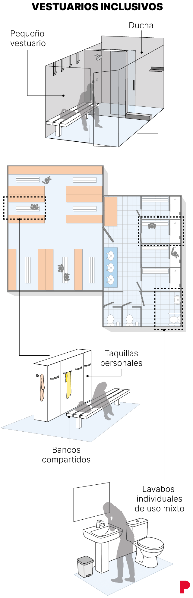 A la práctica, el modelo combina una zona común de taquillas con cabinas totalmente cerradas: algunas con ducha y cambiador, otras con váter y lavabo, y otras solo para cambiarse. Cada persona utiliza su cabina de forma individual, sin quedar expuesta en duchas colectivas.