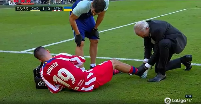 Morata es atendido tras caer lesionado en el partido ante el Cádiz. / Movistar LaLiga