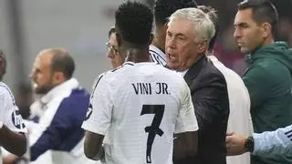Carlo Ancelotti conversa con Vinicius durante el Lille - Real Madrid de Champions. / Associated Press/LaPresse
