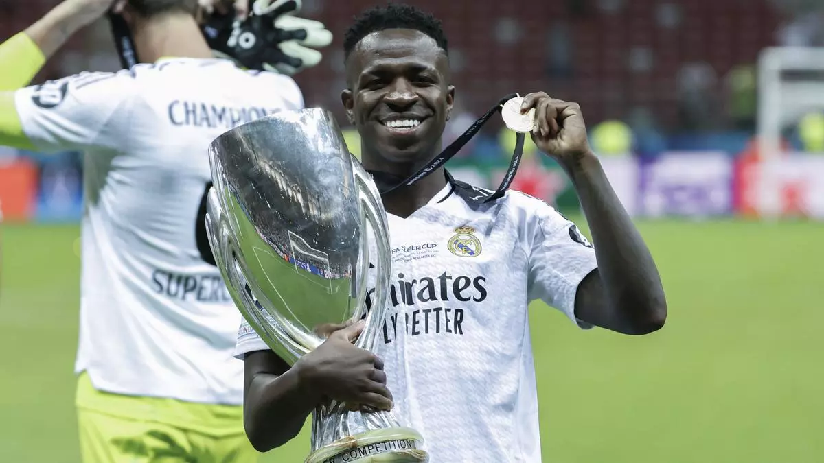 Vinicius, con el título de la Supercopa de Europa que el Real Madrid ganó al Atalanta este verano. / MARISCAL / EFE
