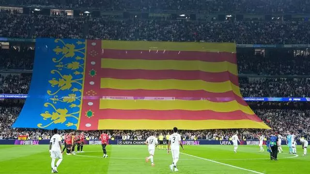 La 'senyera' valenciana desplegada en el Real Madrid - Milan de Champions para homenajear a las víctimas de la DANA. / AFP7 vía Europa Press
