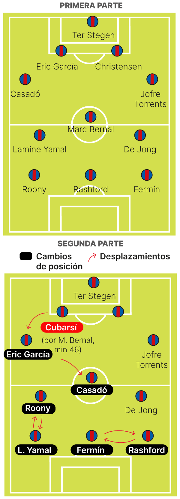 Estaba cansado y frustrado el técnico porque la idea inicial no funcionó y movió todo el equipo con un simple cambio, el de Cubarsí por Marc Bernal- y en los últimos instantes de un partido que no se desencallaba por lo que tuvo que ir metiendo en el campo a Balde, Koundé, Pedri y hasta Gerard Martín, ya tras el 0-1 de Christensen, para recobrar la silueta de la zaga titular en el estreno copero.
