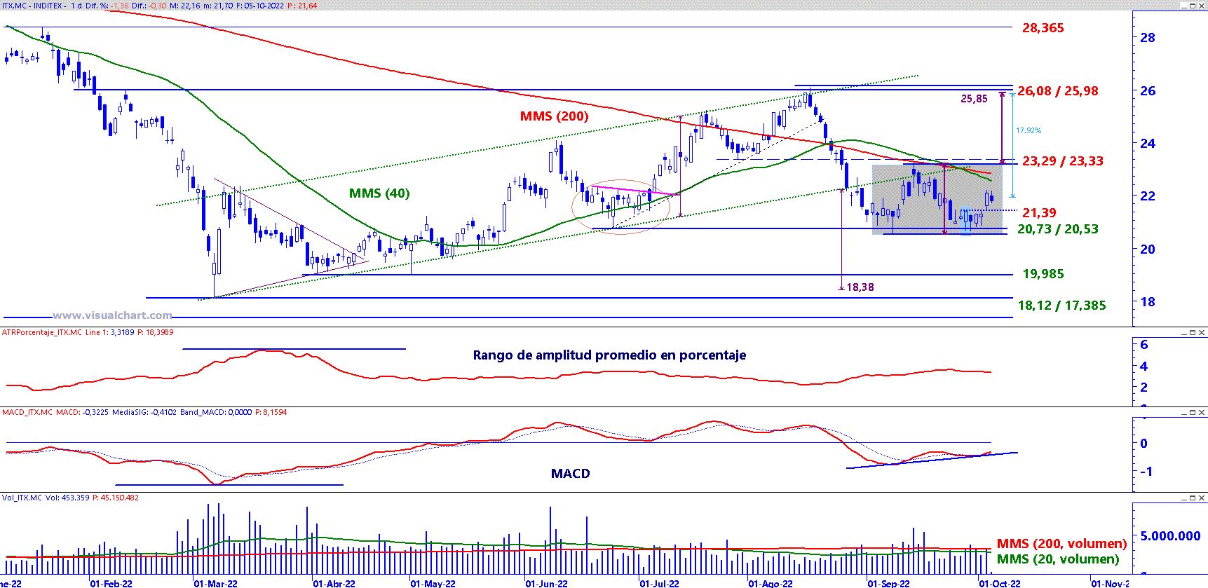 El siguiente hito sería superar la zona de resistencia comprendida en torno 26,08 / 25,98 euros, cuya vulneración, reanudaría la estructura de mínimos y máximos ascendentes que parte desde MAR 2022.