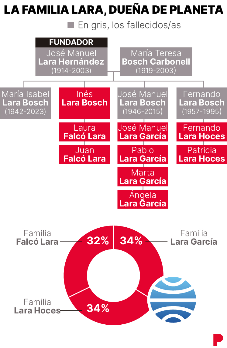 El capital de Planeta estaba dividido en cuatro: los Lara Bosch; los Lara Hoces -hijos de Fernando Lara; los Falcó Lara -hijos de Inés Lara- y María Isabel, la única de los cuatro hijos del fundador que no tuvo descendencia. Esta última falleció el año pasado y su participación del 24% se repartió entre las otras tres ramas familiares. Así, los Lara García, que tenían el 26%, pasaron a controlar el 34%, al igual que los dos hijos de Fernando Lara, el que estaba llamado a ser el gran mandamás y que falleció en un accidente en 1995; también elevaron su participación al 34%, mientras que los Falcó Lara, hijos de Inés Lara Bosch, pasaron del 24% al 32%.