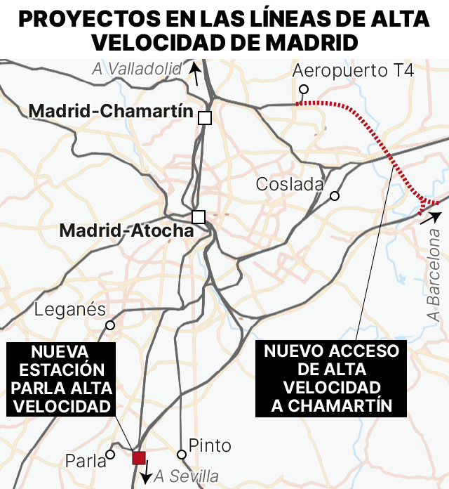 El anuncio lo hizo Puente el lunes y, este martes, el Diario Oficial de la Unión Europea (DOUE) publicaba la licitación de sendos estudios, por un importe de 2,3 millones de euros. En ellos se analizará, por una parte, las nuevas variantes de acceso a Barcelona y Madrid y, por otro, la construcción de dos nuevas estaciones de alta velocidad en El Prat de Llobregat, junto al aeropuerto, y en Parla (Madrid). Otra de las características de los proyectos es que se conectarán con los servicios de Rodalies, en el núcleo barcelonés, y de Cercanías en el madrileño: el objetivo es mallar al máximo la red y que sea intermodal.