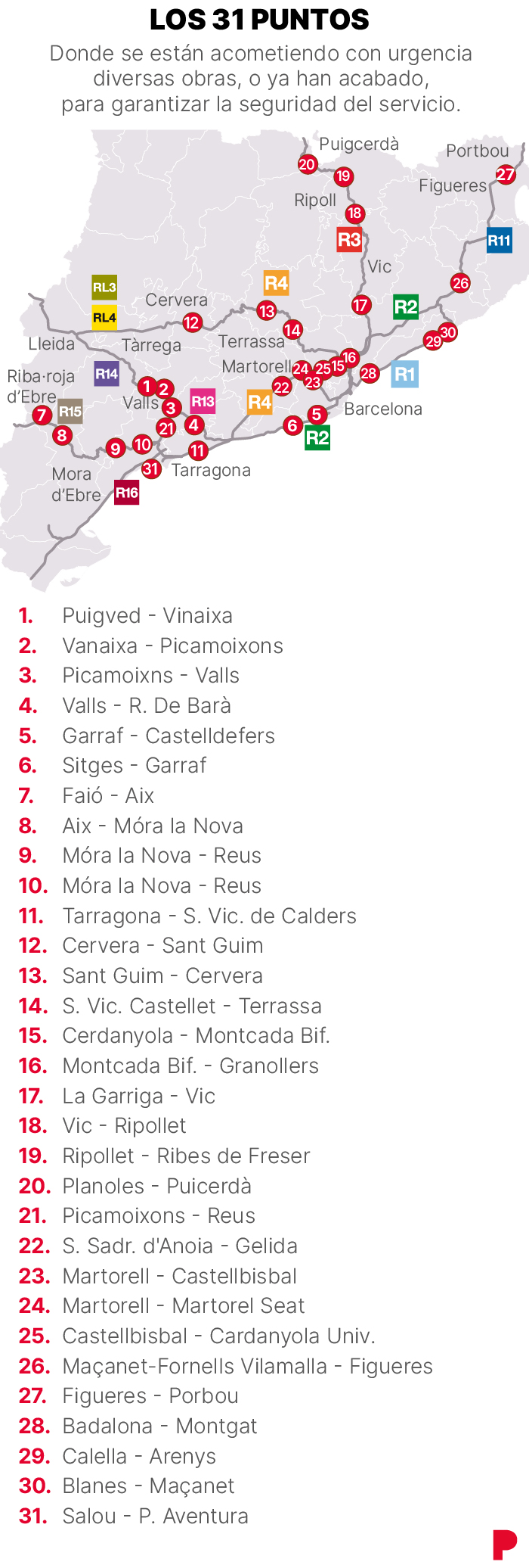 Cabe decir que en cada uno de estos 31 tramos críticos se dan casos en los que no hay solo una reparación a afrontar, sino varias. Fuentes de Adif apuntan a que suman hasta 91 puntos donde se han detectado deficiencias graves. Esto ha provocado que la empresa pública dependiente del Ministerio de Transportes haya contratado los trabajos por la vía de urgencia. Hasta el momento, se han finalizado 12 de ellos. La dificultad en la reparación de estos desperfectos es dispar y puede ocurrir, como es el caso de Rubí o Gelida, que incluya diferentes trabajos: desde asegurar un talud hasta reparar una catenaria o recolocar el balasto donde se sitúan las vías. O que sea más simple.