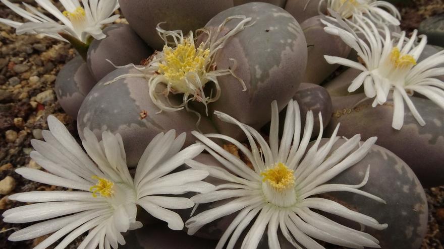 Aunque su morfología recuerda claramente a una piedra, es una planta carnosa que suele estar formada por dos hojas divididas por una fisura. Es a través de esa rajita por donde suelen brotar las flores, que son pequeñas y se asemejan a las margaritas y, tras un ciclo completo de un año y cuando las hojas antiguas se van marchitando, por donde salen las nuevas hojas. Son originarias de las regiones del sur de África, donde apenas llueve en todo el año y, como buena suculenta, tienen una gran capacidad para almacenar agua y son capaces de sobrevivir en situaciones de gran escasez, tomando la que necesitan de la niebla o el rocío. Eso sí, necesitan mucha luz directa. Existen hasta 109 variedades de Lithops, que adoptan diferentes formas y colores. Hay que tener en cuenta que, en su entorno natural, crecen entre las piedras y es por su asombrosa capacidad de adaptación por lo que evitan ser devoradas por los animales.