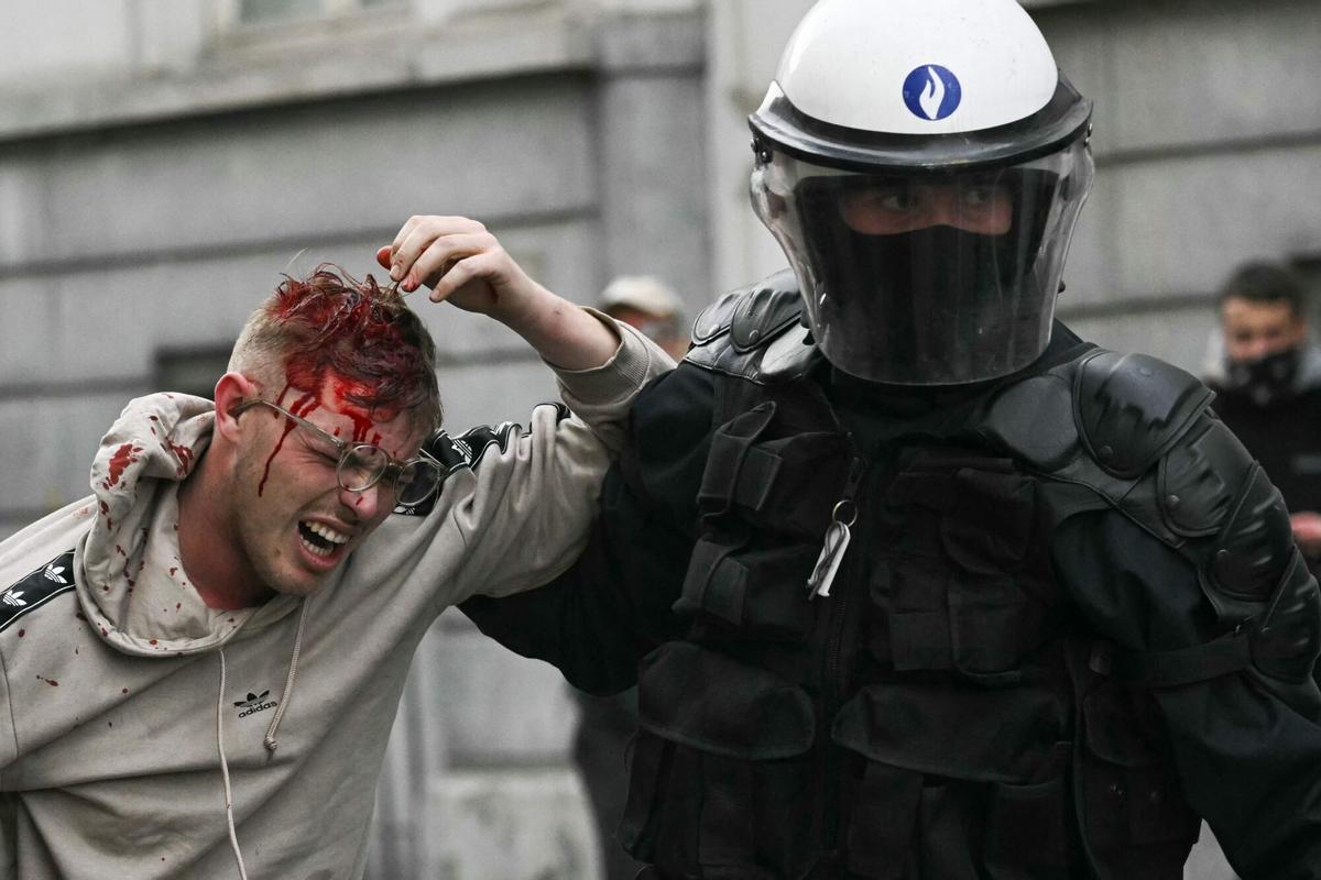 Un manifestante herido descansa sentado en un bordillo durante los enfrentamientos frente al Parlamento Europeo. 18 de diciembre de 2025, Bruselas.