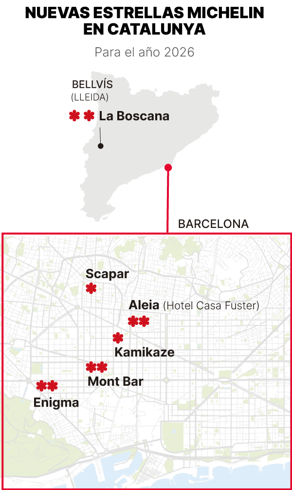 Guía Michelin 2026: BCN triunfa con tres nuevos 'biestrellados' (Aleia, Enigma y Mont Bar), a los que se suma La Boscana (Bellvís, Lleida)