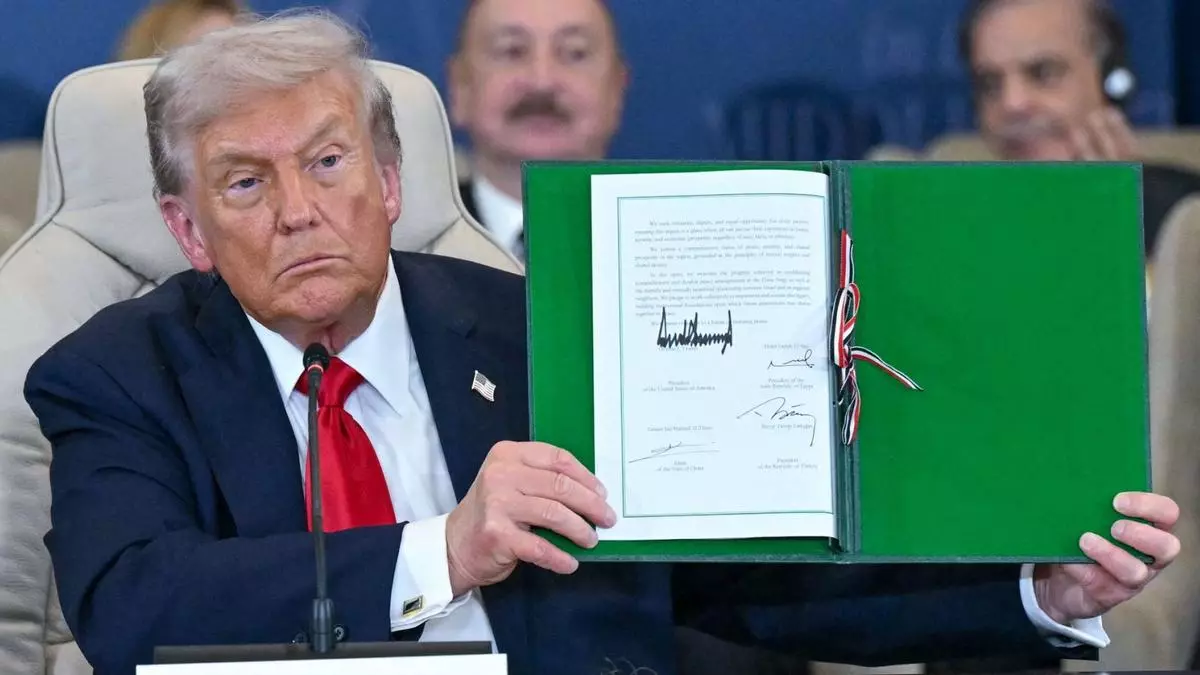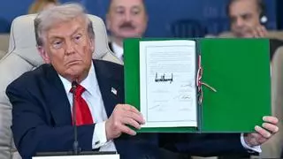 Donald Trump muestra el documento del plan de paz firmado en Sharm el Sheij | SAUL LOEB / AFP