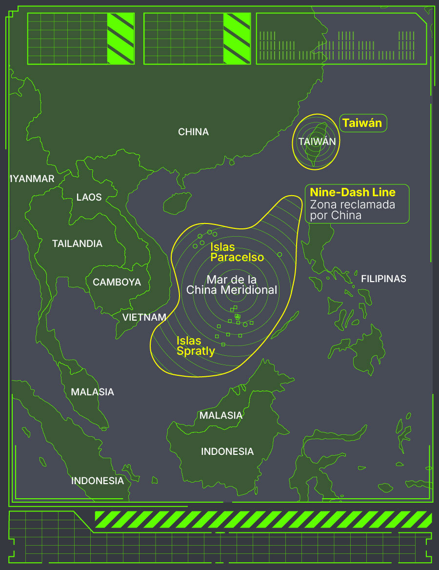 También China opera con agresividad creciente en su patio trasero. Particularmente en torno a Taiwán, pero también reclama como suyo el grueso de los territorios marítimos del Mar de Sur de China, que se disputa con otros países ribereños. Recientemente, en respuesta a la venta de armas de EEUU, lanzó dos docenas de misiles de largo alcance cerca de las aguas taiwanesas y rodeó la isla con bombarderos, cazas y buques de guerra durante dos días de maniobras intimidatorias.