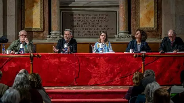 De izquierda a derecha, Jordi Martí, Jaume Angelats, Roser Homar, Marina Garcés y Joan Ferrer, el miércoles, en el Aula Magna de la Facultad de Teología de Catalunya / Manu Mitru