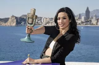 La artista Chanel ganadora de Benidorm Fest 2022, posa con su trofeo en el Mirador del Castillo, en Benidorm. / Joaquín Reina - Europa Press