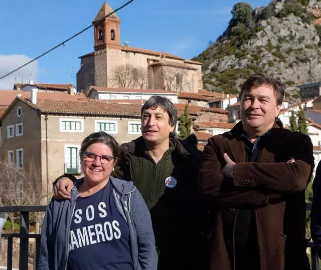 El diputado de Teruel Existe, Tomás Guitarte (d) junto al representante de Soria Ya, Toño Palomar (c) e Inmaculada Sáenz, de "Sos Cameros", durante la reunión de la Coordinadora de las Plataformas de la "España vaciada"