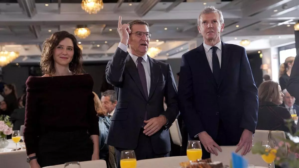 Alberto Núñez Feijóo junto a Alfonso Rueda e Isabel Díaz Ayuso en un desayuno en Madrid. / JOSÉ LUIS ROCA.