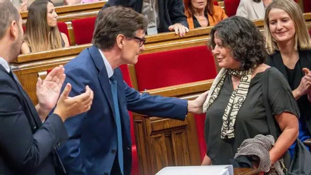Pilar Castillejo es saludada por Salvador Illa en el Parlament. / Manu Mitru / EPC
