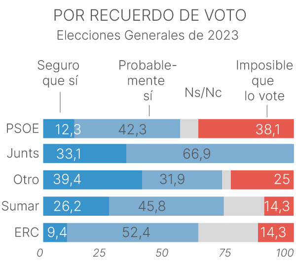 Según la última encuesta del Gabinet d’Estudis Socials i Opinió Pública (GESOP) para Prensa Ibérica, seis de cada diez votantes que se sitúan en la izquierda verían con buenos ojos una alianza electoral de este tipo. Un 16,6% asegura que “seguro” la votaría y un 43,3% afirma que “probablemente” lo haría. El dato refleja un terreno fértil para una propuesta conjunta de las fuerzas soberanistas y regionalistas a la izquierda del PSOE como ERC, Compromís, BNG, EH Bildu y Adelante Andalucía. Pero, al mismo tiempo, revela un riesgo electoral evidente para los partidos del Gobierno, ya que esa hipotética candidatura competiría por el mismo espacio de voto que hoy ocupan PSOE y Sumar.