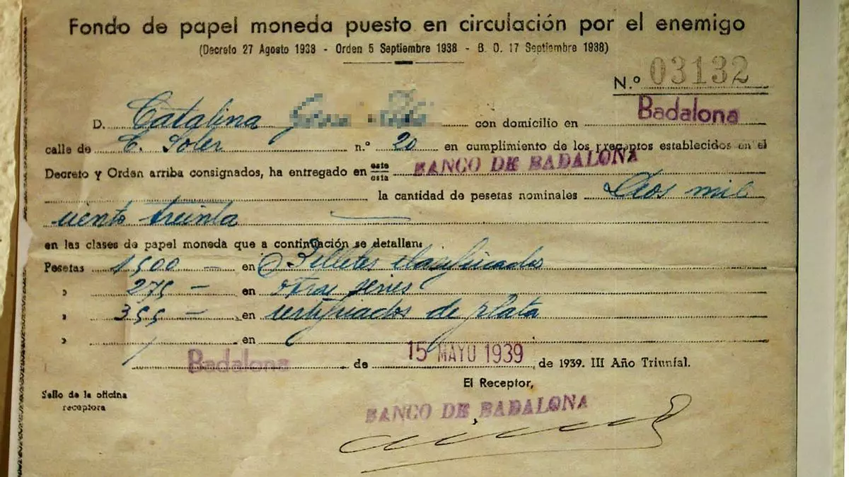 En una conversación con EL PERIÓDICO, coincidiendo con el aniversario del asesinato de su abuelo, Jiménez insiste una y otra vez que su empeño "no es por el dinero". "Es mínimo lo que nos deben, es calderilla para el Estado, pero para nosotros es un tema de honor", alega con un enfado evidente al considerar que el Gobierno no les está dando las explicaciones pertinentes. En su caso son poco más 1.000 pesetas lo que le deben, lo que al cambio serían unos seis euros. El importe es menor, pero es lo que sus familiares tuvieron que entregar a las autoridades franquistas a punto de acabar la Guerra Civil y que, a pesar de la insistencia en recuperarlos, nunca más han vuelto a ver. Porque la guerra, también fue económica. En su lugar solo tiene, como el resto de afectados, un recibo que les dio el banco en el que consta la cuantía con el encabezado 'Fondo de papel moneda puesto en circulación por el enemigo'.