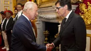 El rey Carlos III de Gran Bretaña saluda al presidente de la Generalitat, Salvador Illa. / AARON CHOWN / AFP