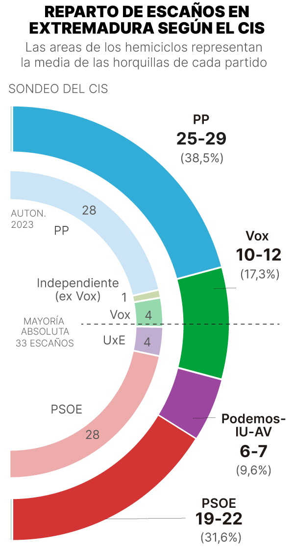 ¿Llegará el PP a la mayoría absoluta en Extremadura? ¿Lo tiene todo perdido el PSOE? Las elecciones, en 6 gráficos