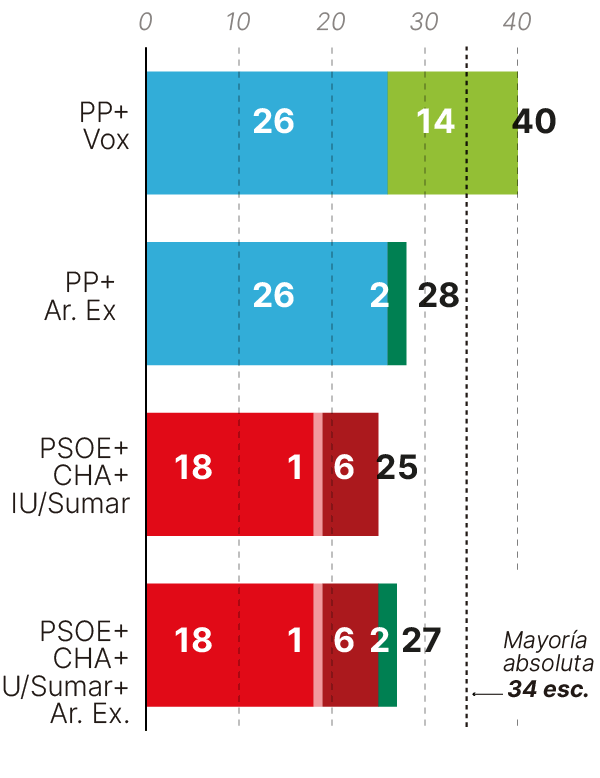 El pactómetro resultante deja pocas dudas: el PP necesitará inexcusablemente a Vox para revalidar el Gobierno de Aragón. La aritmética parlamentaria encierra a Azcón en el mismo escenario que trató de evitar. Así ocurrirá salvo excepciones nada plausibles ahora mismo, como una abstención del PSOE, una doble abstención de Vox y Aragón-Teruel Existe o que los partidos situados a la izquierda se salgan de su guion y faciliten la investidura mediante una abstención o un apoyo puntual.
