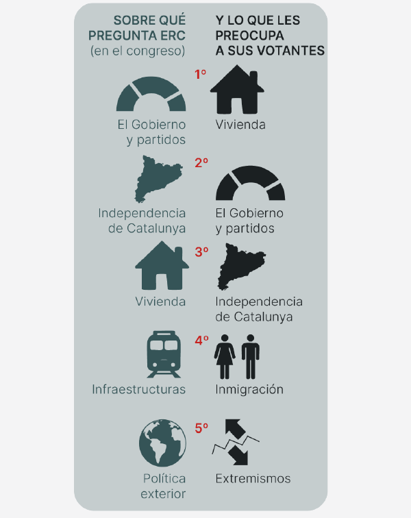 Los intereses de ERC pasan entre otras por las infraestructuras, concretamente sobre el estado y la gestión de Rodalíes, un tema que ha estado presente toda la legislatura desde que los republicanos lo incluyeran en su acuerdo de investidura. De la mano de este asunto van las preguntas sobre la independencia de Catalunya, seguido por las cuestiones sobre la situación del Gobierno. Además, ERC es el partido que más pregunta sobre vivienda. Así, los republicanos catalanes son de los que más se alinean con sus electores, de los más preocupados por la vivienda (35,7%) y por la independencia de Catalunya (9,5%).