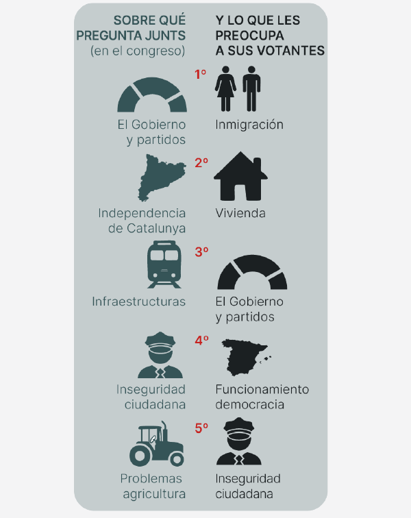 Junts, que lleva meses intentando desligarse del Gobierno, ha preguntado sobre todo por la inestabilidad del Gobierno y los planes de este para agotar la legislatura. A esto, al igual que ERC, le han seguido las infraestructuras por el asunto de Rodalíes y la independencia de Catalunya. Sin embargo, a partir de ahí difieren de los republicanos y los dos temas que más les ha preocupado son los relativos a la agricultura y la ganadería, por un lado, y a la inseguridad ciudadana, por otro. La principal preocupación de sus votantes es la inmigración (26,9%), pero también son de los que más alarma muestran ante la inseguridad ciudadana (2,1%).