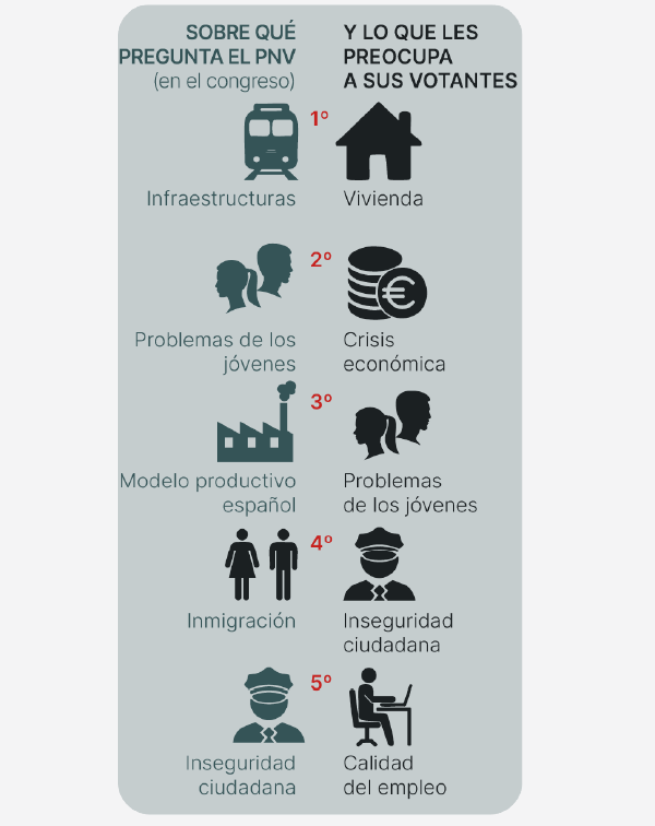 En el caso del PNV es una de cada cinco las preguntas que destina a otros asuntos. Después, son las infraestructuras, los problemas de los jovenes, el modelo productivo español y la inmigración los que más le preocupa a la formación jeltzale. Según el CIS, sus votantes son los más alarmados por la situación económica (14%) y por la inseguridad en las calles (4%).