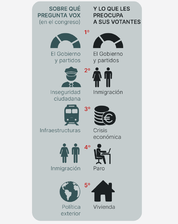 El partido de Santiago Abascal coincide con el PP y dedica gran parte de las cuestiones a los problemas del Ejecutivo. Luego se desligan de los populares. La inseguridad ciudadana y la inmigración son dos de los asuntos que más preocupa a la formación de extrema derecha, seguidas de las infraestructuras y de la política internacional. En este caso, la inmigración sí está entre las principales preocupaciones de sus votantes, seguido de la crisis económica.