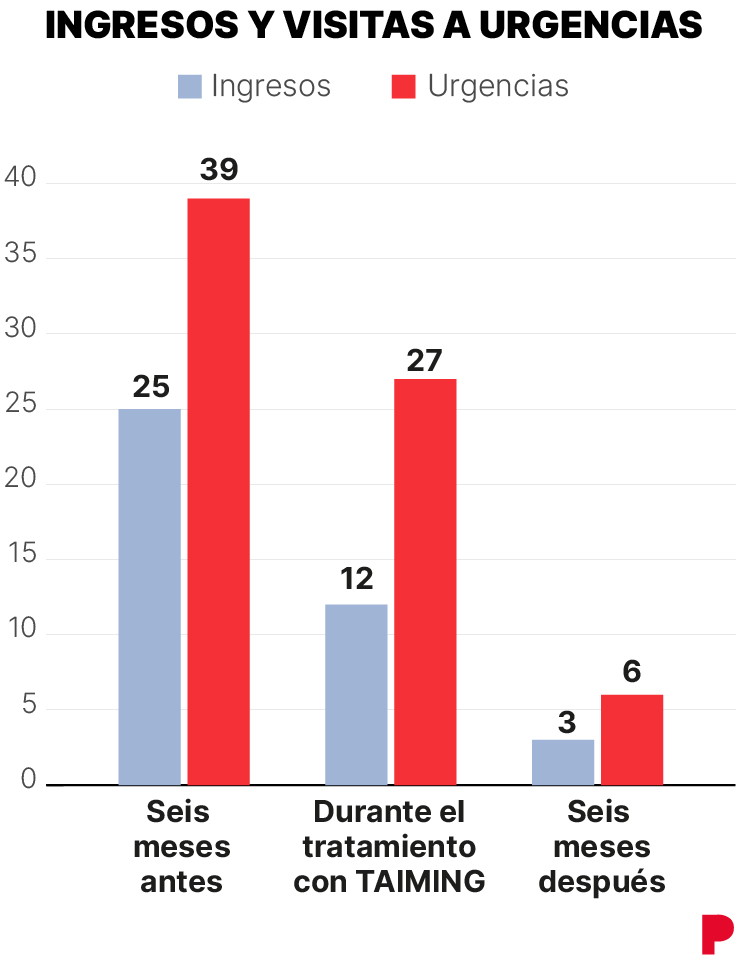 En concreto, seis meses tras aplicar esta terapia, los ingresos hospitalarios y las visitas a urgencias pasan de 25 y casi 40, respectivamente, a cifras casi insignificantes: tres ingresos y seis visitas a urgencias. En cuanto a los síntomas depresivos, pasan del 36% al 26%, tras las sesiones. Y los síntomas ansiosos, del 36% al 22%.
