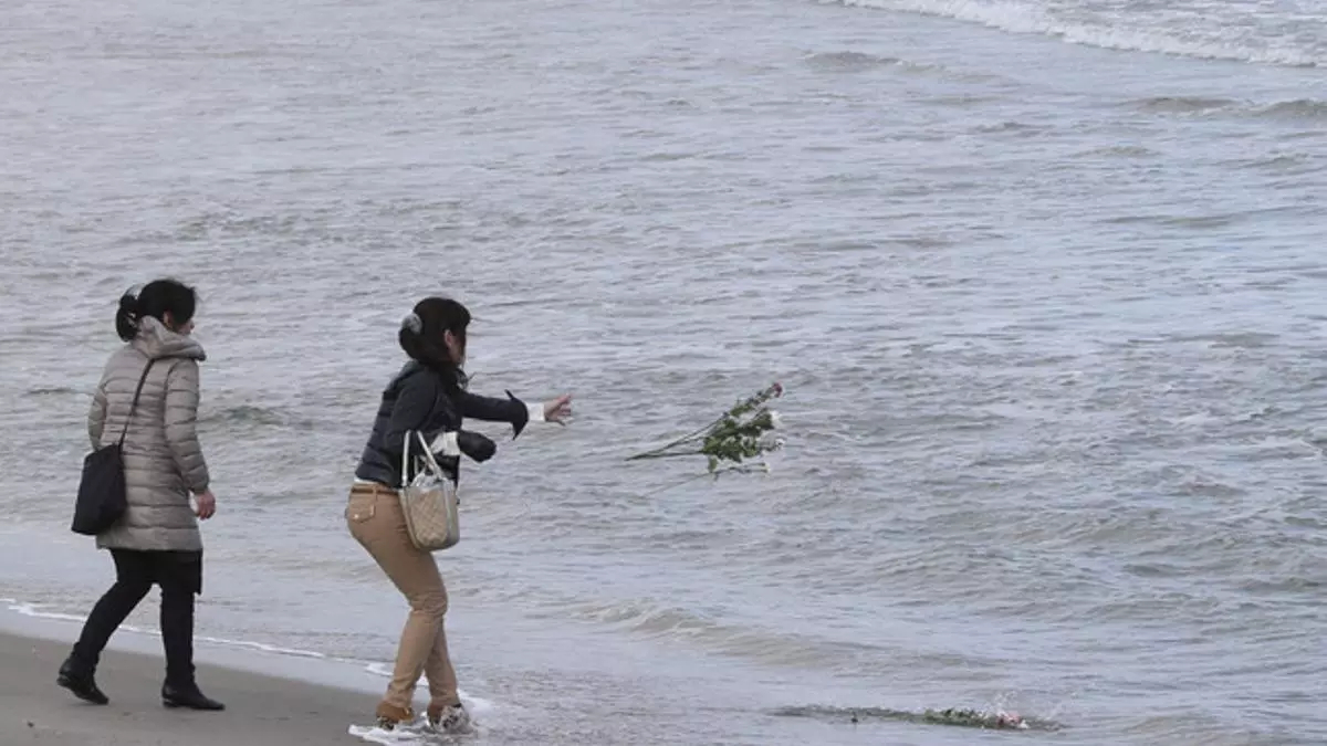 Dos mujeres lanzan flores al mar en memoria de las víctimas del tsunami. / KS TT**TOK**