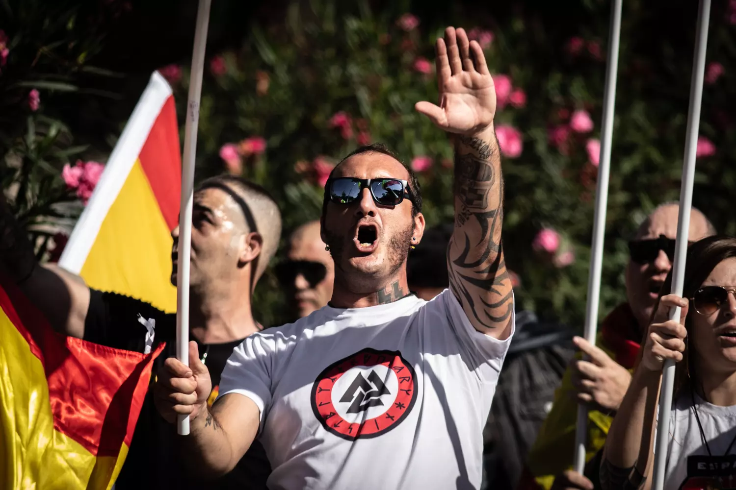 Un hombre levanta el brazo durante una manifestación neonazi para celebrar el día de la Hispanidad