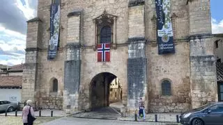 La bandera de Noruega luce en el Archivo del Adelantamiento de Castilla de Covarrubias, construido en el siglo XVI y que sirve de entrada al núcleo histórico de este pueblo de Burgos. / EPE