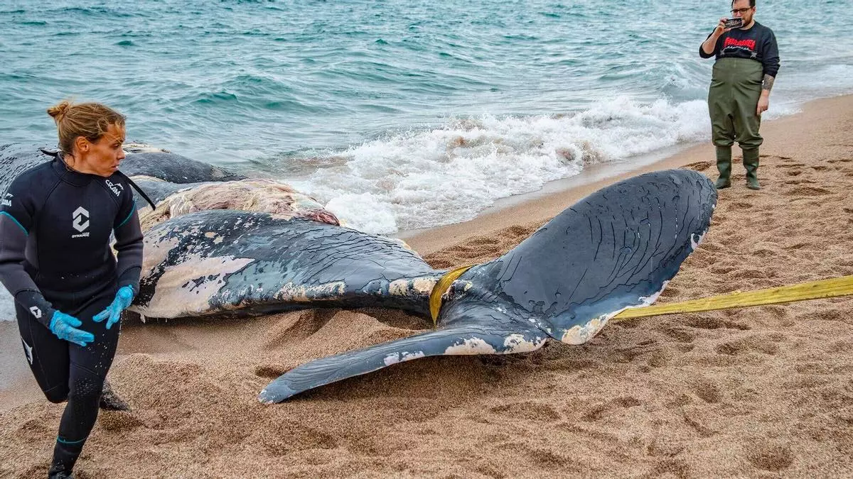 Una ballena, encontrada muerta en la playa de Pals (Baix Empordà, Girona), este sábado. / Oriol Leza