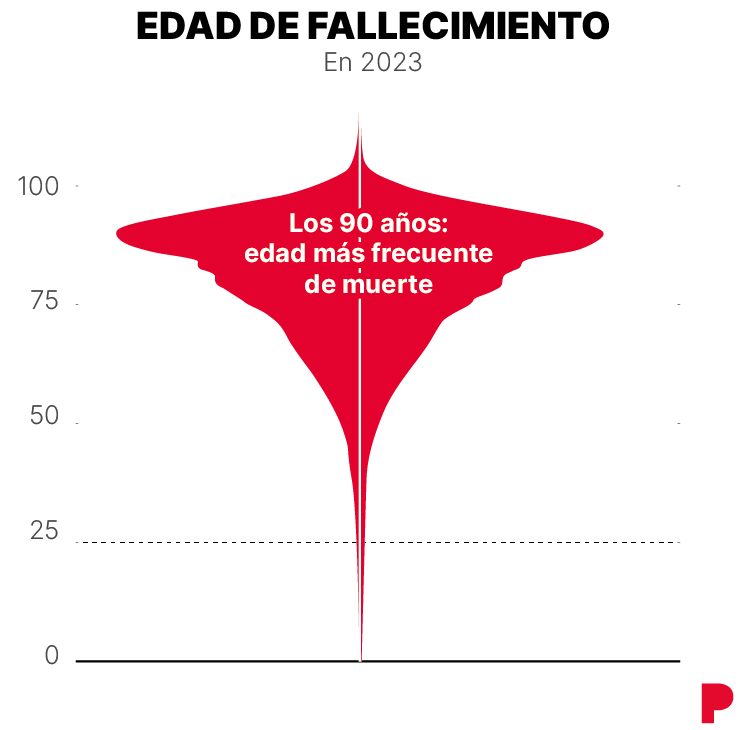 España despunta en longevidad, hasta el punto de que la edad a la que se alcanza la muerte con más frecuencia no es en la setentena ni en la ochentena, sino que ha llegado ya los 90 años. De hecho, uno de cada cuatro fallecidos en 2023 tenía 90 años o más, según los datos presentados este jueves por el Col.legi d'Actuaris de Catalunya (CAC) en la jornada ‘Análisis de longevidad’.