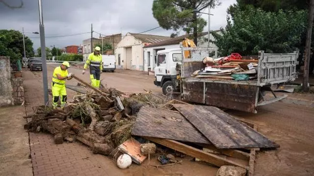 Vecinos y bomberos colaboran en la limpieza de enseres personales y calles del Santa Bàrbara (Montsià) tras el paso de la DANA Alice. / Zowy Voeten