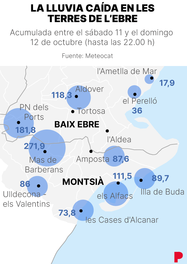 Las lluvias han impactado en la comarca del Montsià, donde las calles se han inundado con rapidez, dejando a personas atrapadas en vehículos y en bajos de inmuebles en un episodio que el mismo alcalde de Santa Bàrbara, Josep Lluís Gimeno, ha calificado como "histórico" por su virulencia y duración. Para ser concretos, en una hora, la estación meteorológica de Mas de Barberans ha pasado de 30 a 114 mm registrados, y a las 21 horas la cifra ha superado los 187mm, y varias estaciones del Baix Ebre también han superado los 100 mm. No se han reportado daños personales.