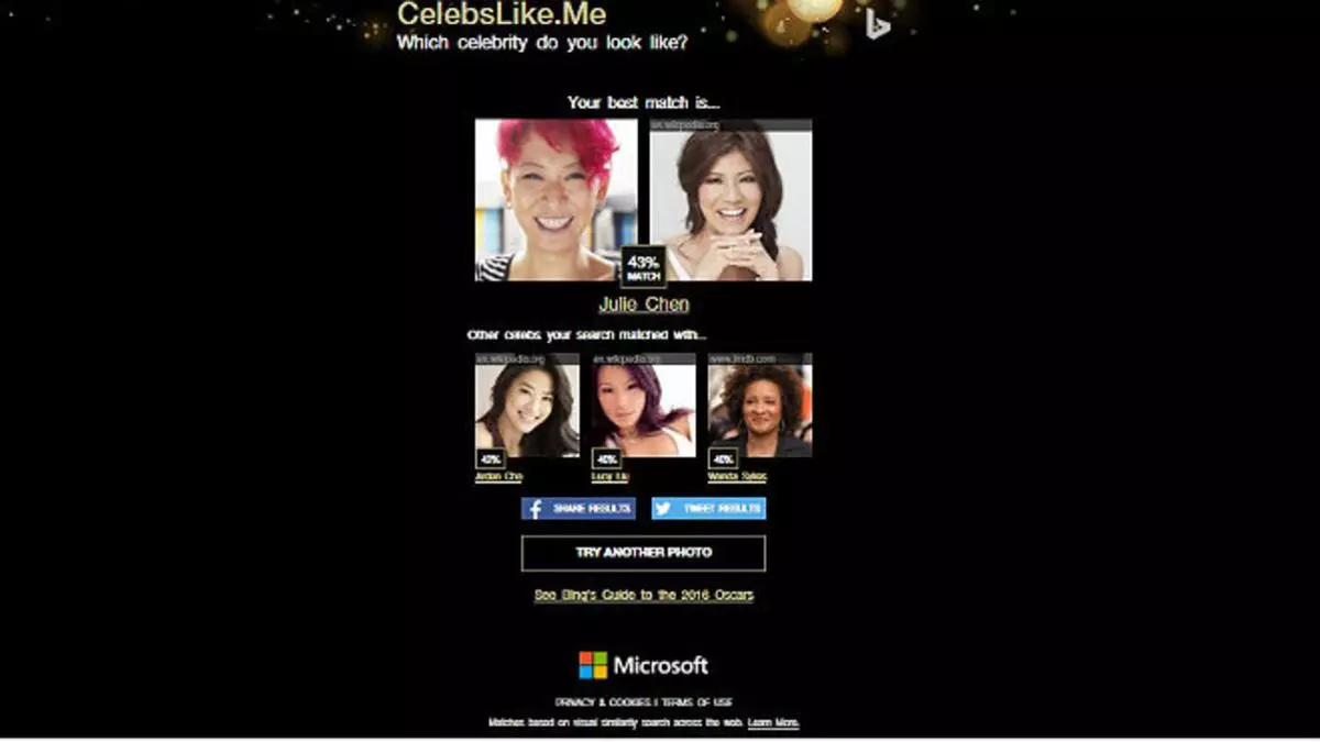 La aplicación te pide que utilices una foto para contrastarla con las fotos de estrellas norteamericanas. Tras una evaluación supuestamente exhaustiva, da cuatro resultados, el parecido más razonable y los tres que le siguen.