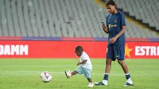Lamine Yamal graba a su hermano Keyne al finalizar el partido de liga entre el Barça y el Athletic de Bilbao de agosto pasado. / Jordi Cotrina